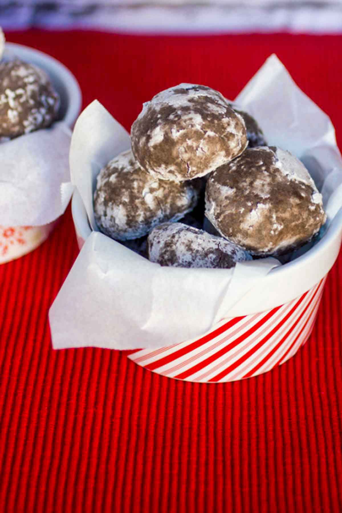 - In a small bowl combine powdered sugar and cocoa powder, roll each ball into the mixture. Brush off any excess.1/2 cup (60 g) powdered sugar, 1 tablespoon (5 g) cocoa powder
